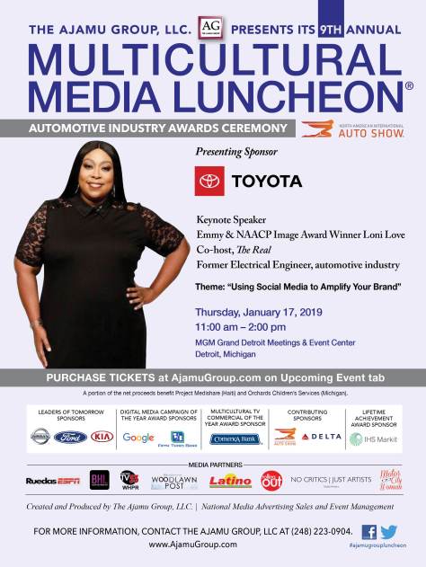 Show off your best fit w/ #Emmy Award-winning, American comedian, television host, actress and author @LoniLove , from #TheReal, and hear her keynote for @TheAjamuGroup 2019 Multicultural Media Luncheon in #Detroit , Jan17 powered by @Toyota ! cc: @CherylAjamu of @TheAjamuGroup #NaiasDetroit #AjamuGroupLuncheon #AjamuGroup