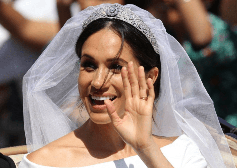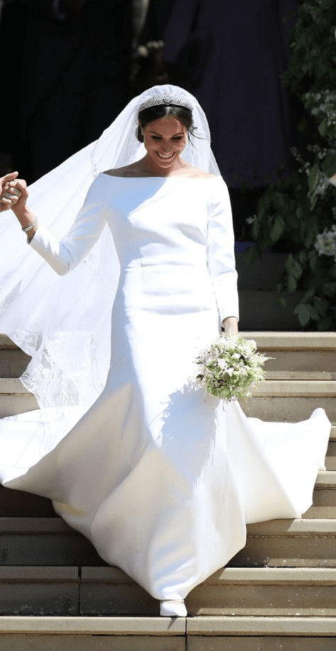 The minimalist pure white gown has a boat neck, framing the shoulders and emphasising Ms Markle’s waist, and three-quarter length sleeves. The haute couture dress is made of double-bonded silk cady cushioned by an underskirt in triple silk organza. Ms Markle’s veil was held in place by Queen Mary’s diamond bandeau tiara, loaned to her by the Queen.It is named after the wife of King George V, the Queen’s grandfather.At the centre of the bandeau is a detachable brooch of 10 brilliant diamonds, which was given to Queen Mary as a wedding present in 1893. The brooch was later made into the tiara in 1932.The headpiece also includes diamonds and platinum in 11 sections. Ms Markle also wore earrings and bracelet made by Cartier.